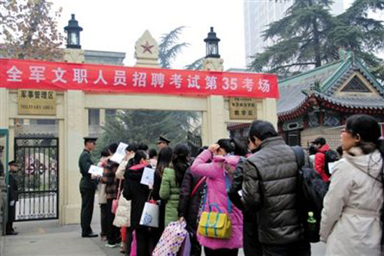 12月15日,在解放軍南京政治學(xué)院考點,考生等候進(jìn)場參加考試。當(dāng)日,軍隊首次統(tǒng)一招聘文職人員考試舉行,據(jù)解放軍總政治部有關(guān)部門介紹,共有10萬余人報名應(yīng)聘,報名和錄取比例平均為38∶1。